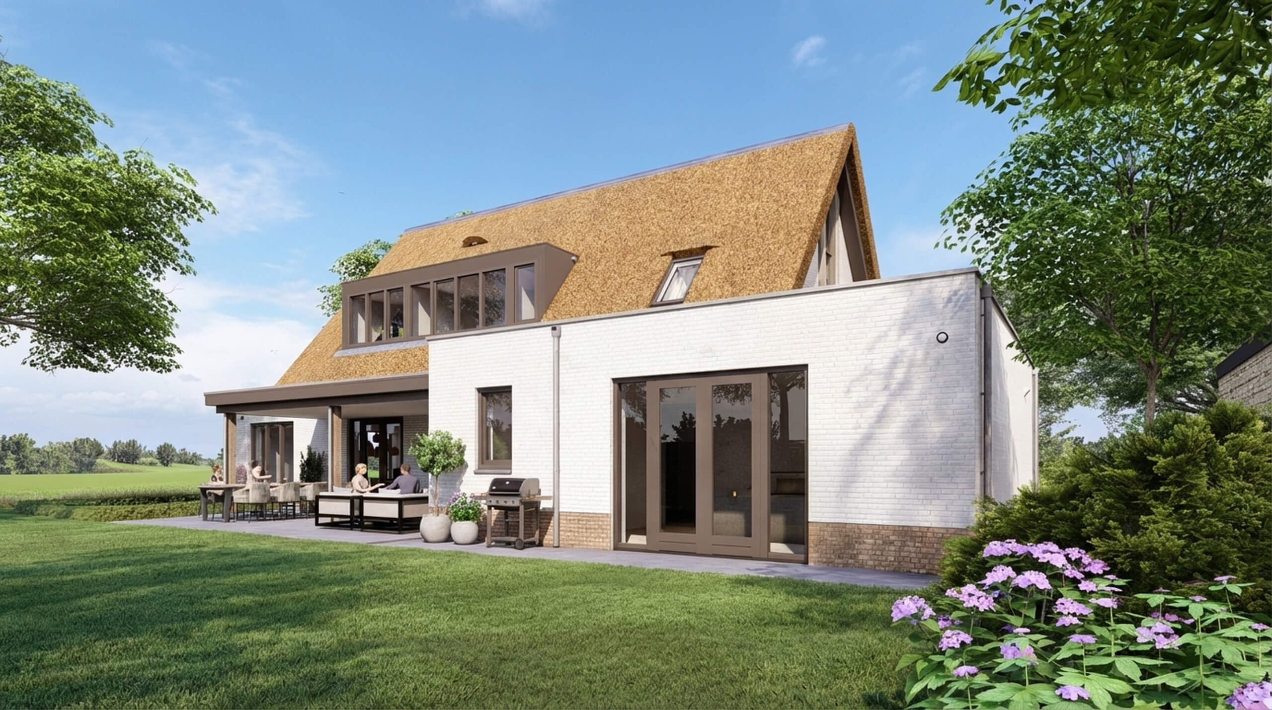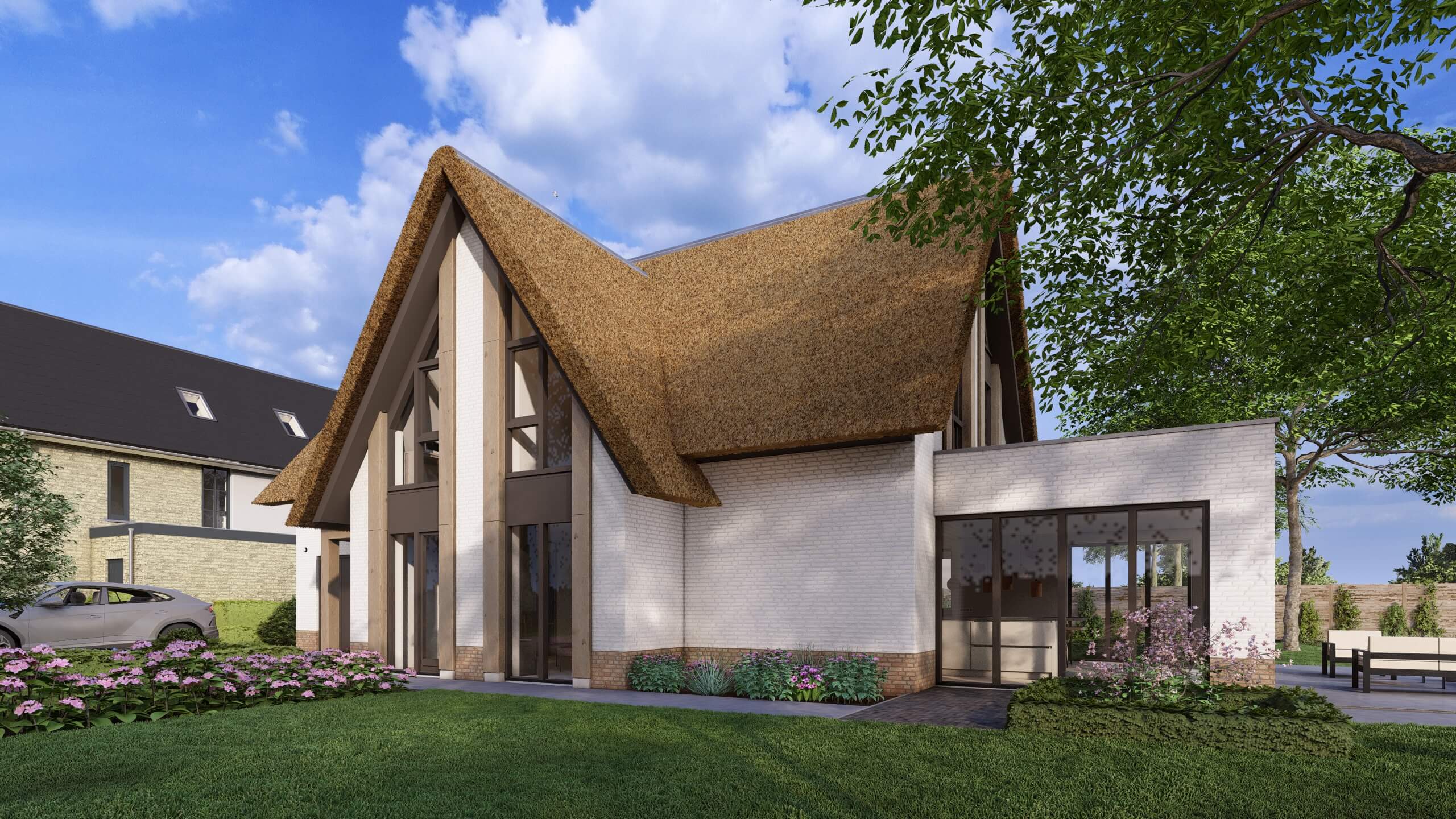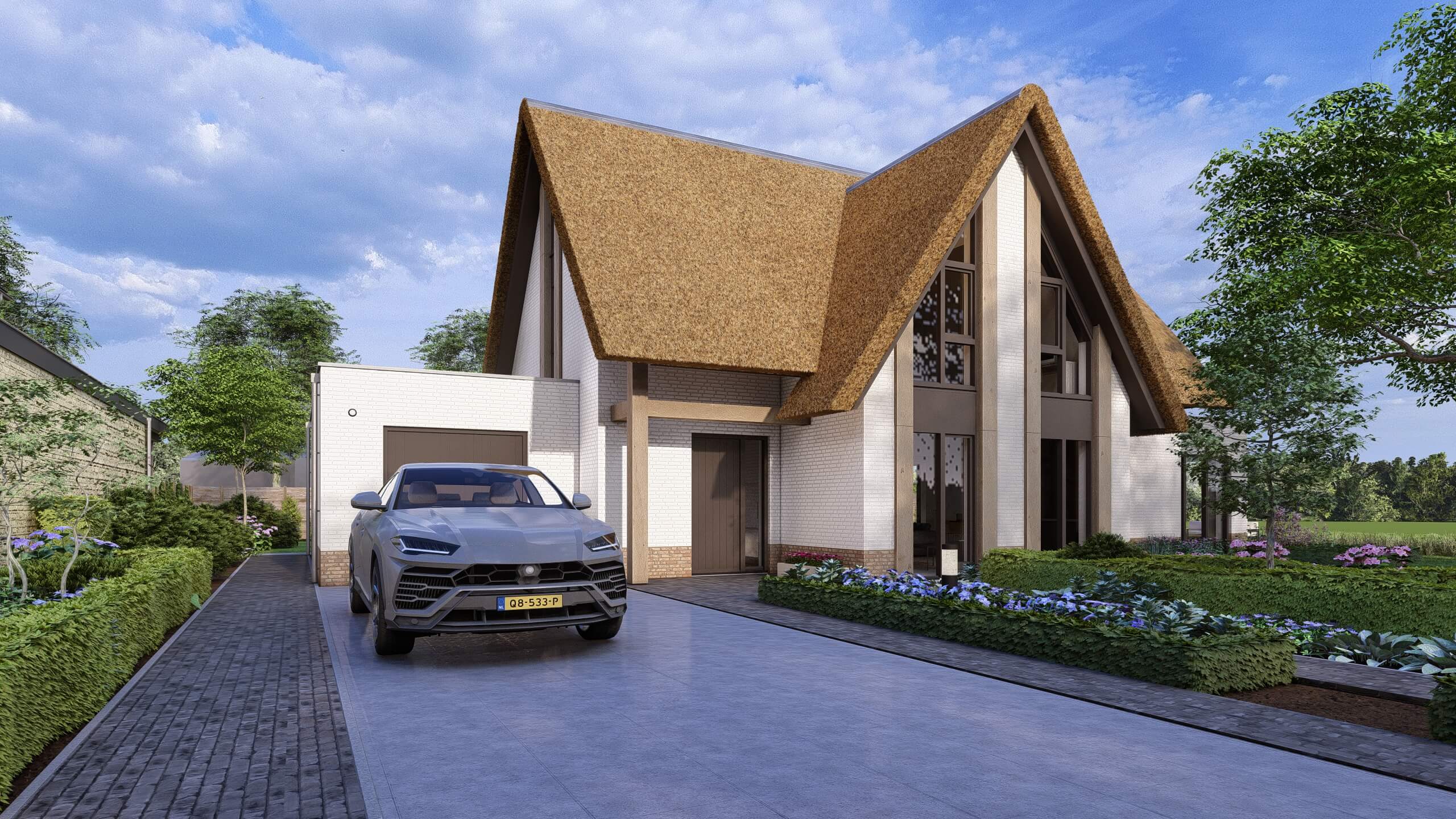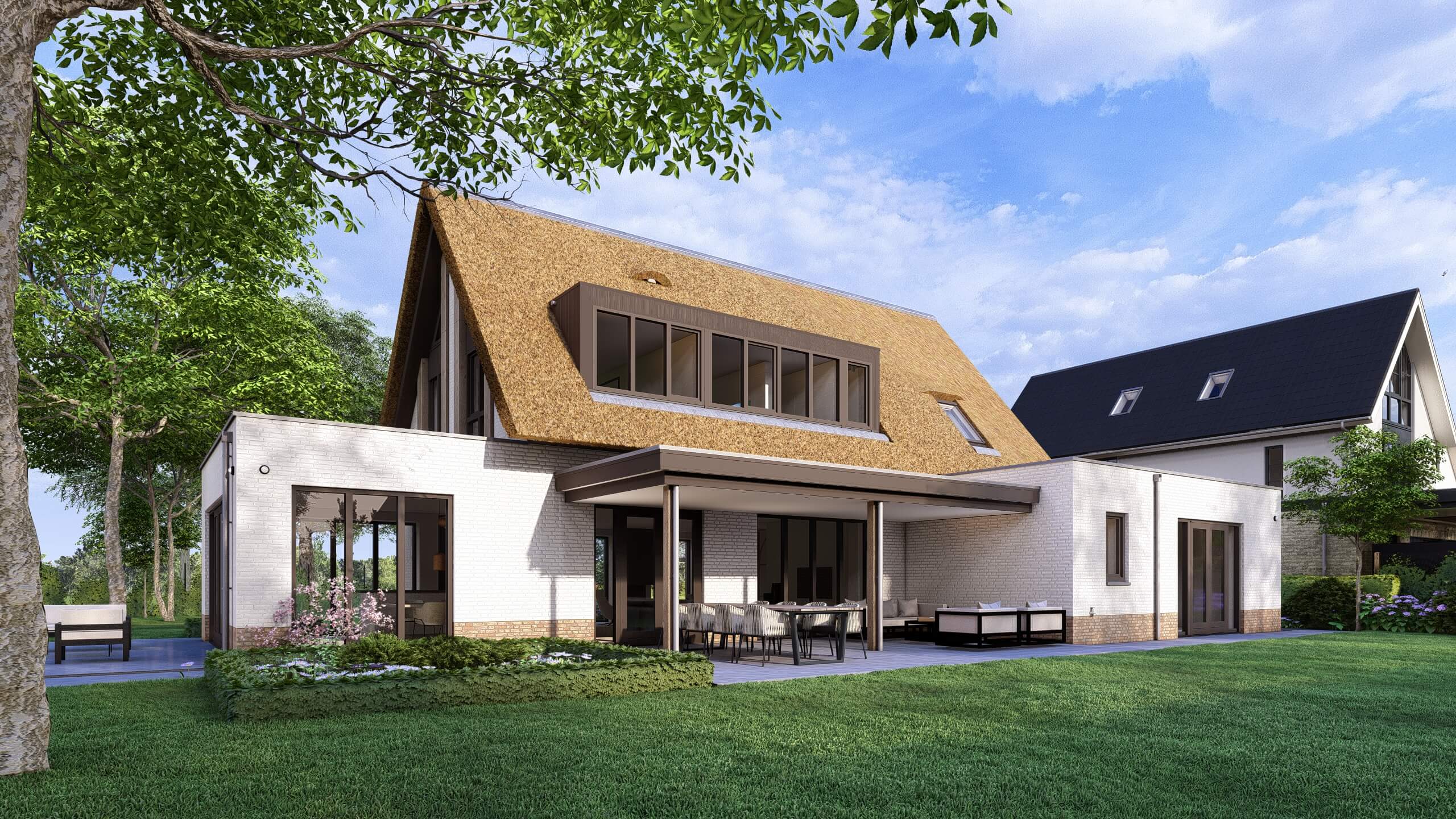 Villa Goudplevier is een op maat ontworpen riet gedekte landelijk, moderne woning. De houten accenten, het verticale lijnenspel en de grote raampartijen geven de woning een warme en eigentijdse uitstraling. De villa staat midden op het royale kavel en baadt rondom in het licht.