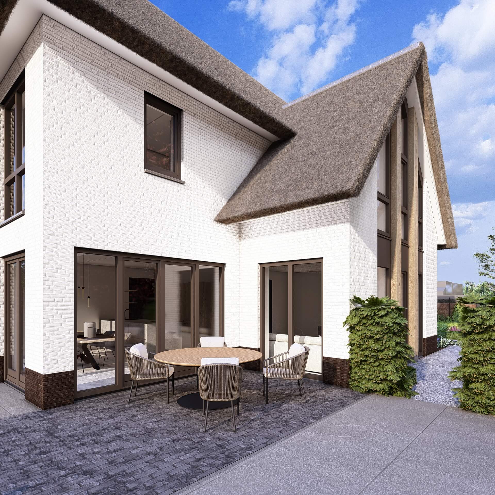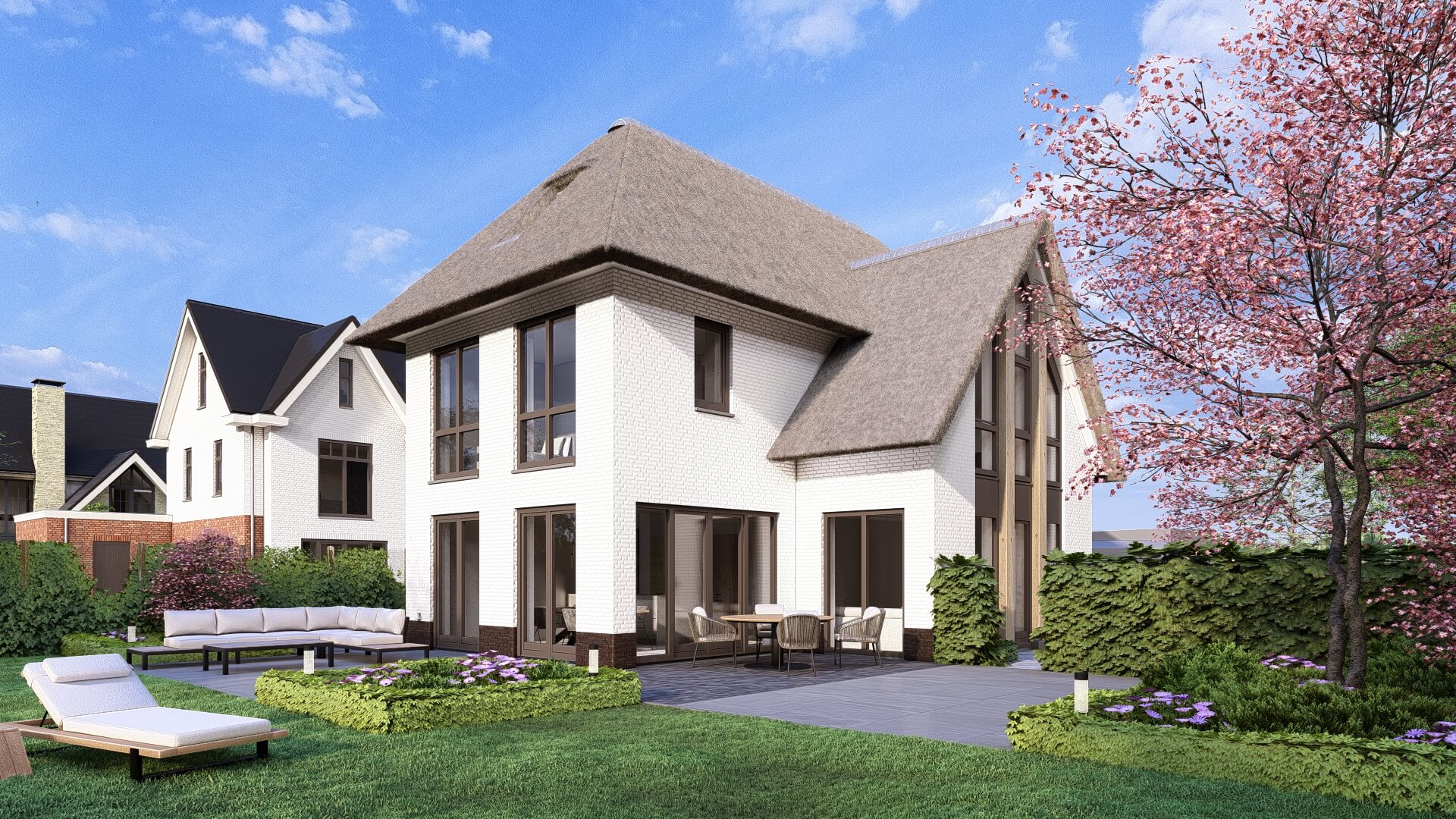 Villa Rietgors is een op maat ontworpen, riet gedekte, landelijk, moderne villa. De houten accenten, het verticale lijnenspel en de grote raampartijen geven de woning een warme en eigentijdse uitstraling.